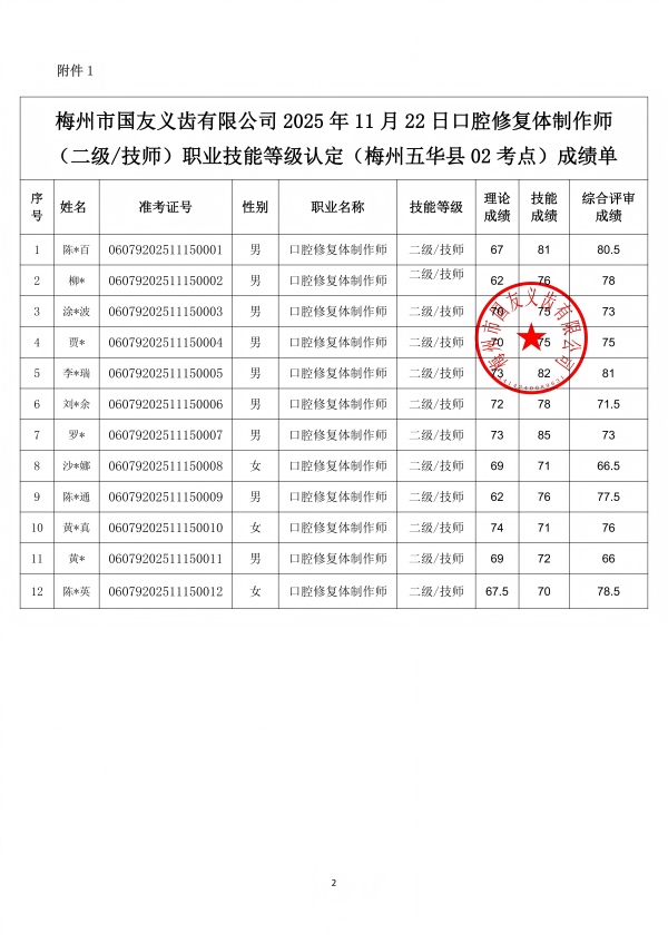 梅州市国友义齿有限公司于11月22 日进行了口腔修复体制作师等级认定。现将考试成绩对外进行公示。